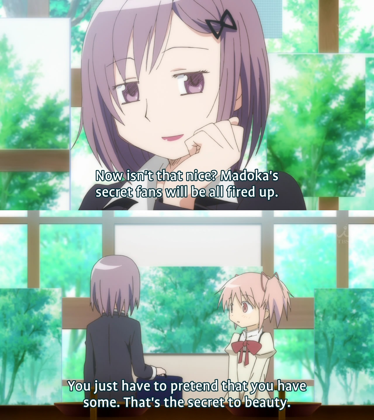 Turns out there are two transfer students: Homura, the shy girl that rarely speaks and stutters when she does, and Kyouko, the tomboy that is actually very feminine inside.