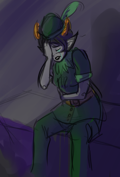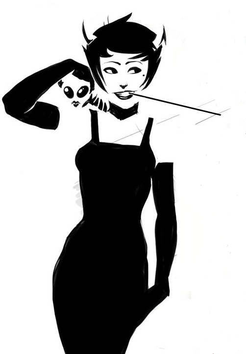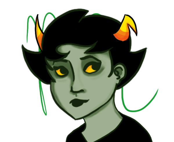 A barely audible sigh passed by John’s lips. Vriska heard him and pulled away from him. Her throat clacked a bit but she kept her eyes, glinting with amusement and other playful thoughts, on John’s face. He looked down at her to see her blue lips brushing against the tip of his penis through the thicket of black hair. “Vriska…”, he whispered, reaching down to stroke her hair and pull it away from her face.