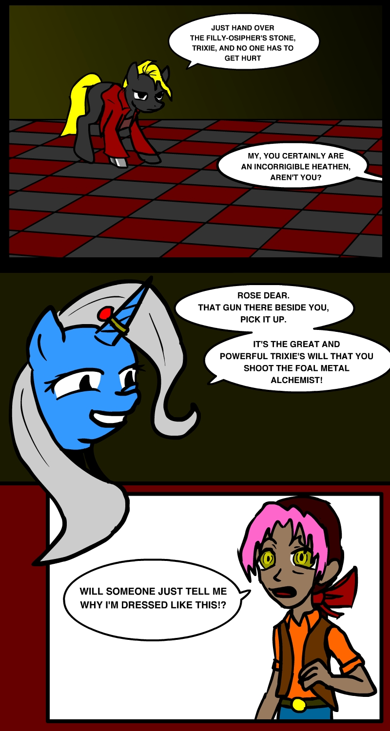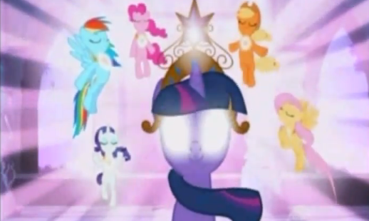 Days before the fated night, the artificially ageless monarch sent her cleverest, most trustworthy student to a town on the edge of her armor's powers, near a forest that held the Castle. She knew of the town, because the armor was forged there a thousand years before; the Guardian of Harmony named Honesty had smithed the armor and bound the Guardians' wills into it, but was quickly approaching the edge of her own unnatural lifespan. Only in such a location, on the edge of light and dark, and close to the mystically charged ruins where Pony blood was spilled by Pony magic, could the Elements of Harmony once again be reignited.