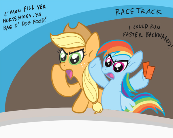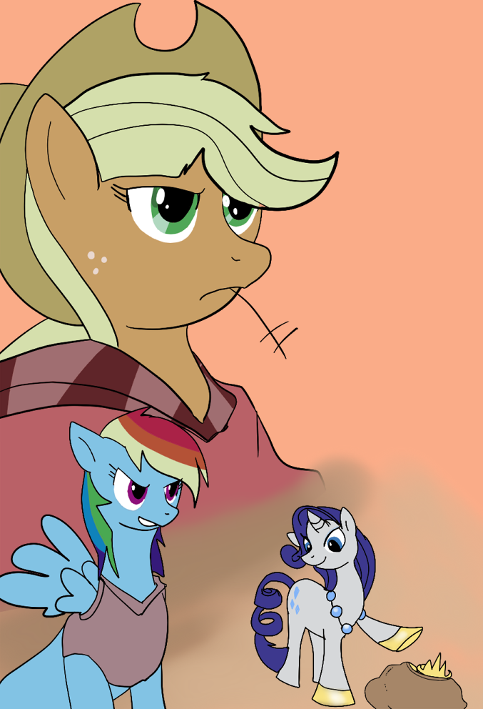 "Now wait just a minute!" said Applejack, confused. "What in the hay you think yer doing?"