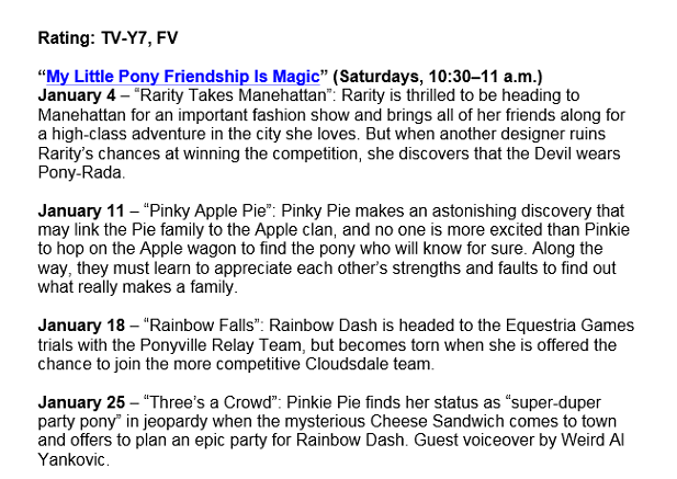 >>15248450>A short synopsis has been revealed for Episode 11 “Three’s a Crowd” which is scheduled to debut on Hub Network on January 25 at 10:30AM ET. What is more exciting is that this episode will feature a special guest voiceover by Weird Al Yankovic. Details below…January 25 – “Three’s a Crowd”: Pinkie Pie finds her status as “super-duper party pony” in jeopardy when the mysterious Cheese Sandwich comes to town and offers to plan an epic party for Rainbow Dash. Guest voiceover by Weird Al Yankovic.